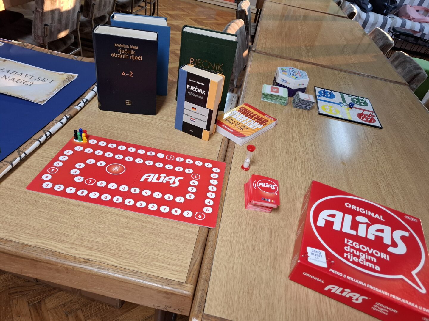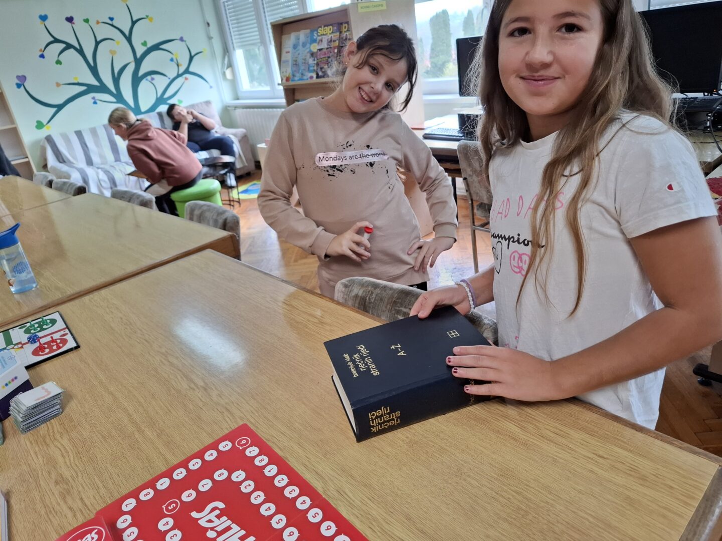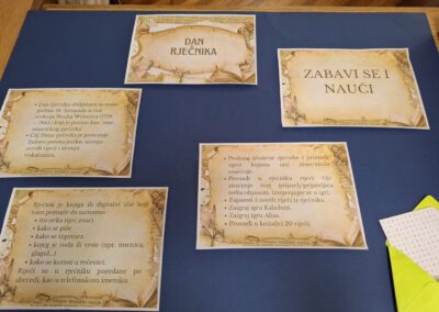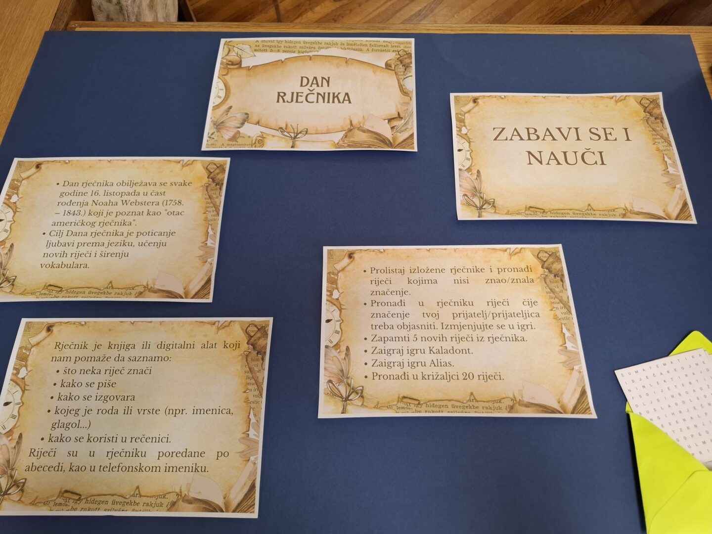 Danas smo u školskoj knjižnici obilježili Dan rječnika. Knjižničarka je postavila malu izložbu rječnika, pripremila plakat i aktivnosti za učenike. Učenici su tražili nepoznate riječi u rječnicima, ispitivali svoje prijatelje o njima i pamtili nove riječi. Zabavili su se traženjem što većeg broja riječi u osmosmjerci, a posebno ih je oduševila igra Alias kojom su dodatno bogatili svoj rječnik.