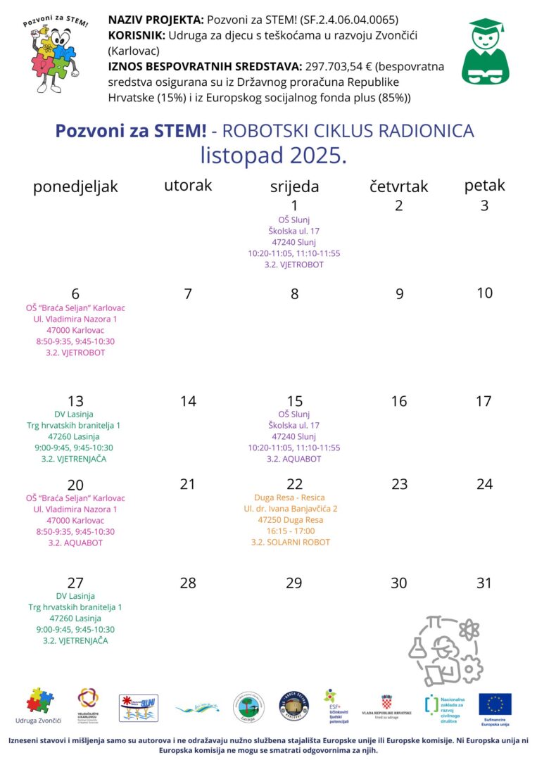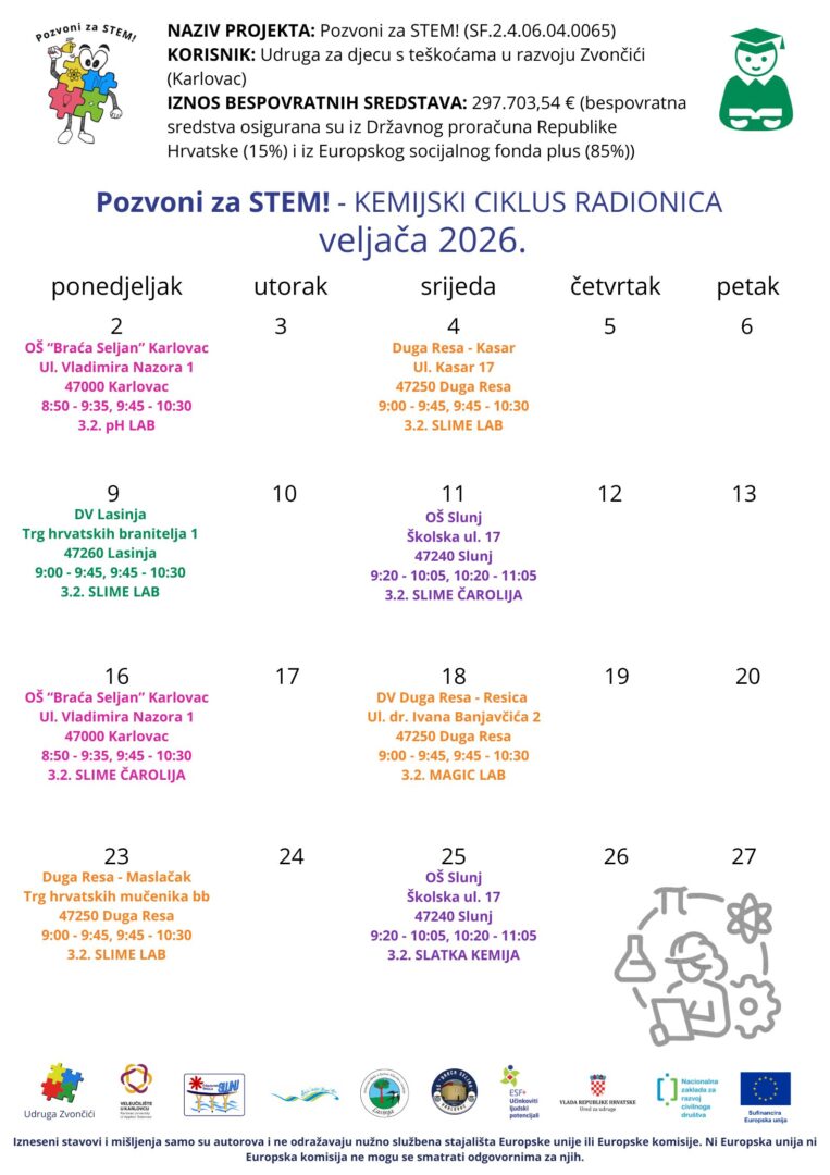 Udruga za djecu s teškoćama u razvoju Zvončići najavljuje nastavak edukativnih i interaktivnih radionica za djecu osnovnoškolske i vrtićke dobi u STEM području, a koje se provode u sklopu projekta sufinanciranog sredstvima Europske Unije naziva „Pozvoni za STEM!“ SF.2.4.06.04.0065 u iznosu od 297.703,54 €.
