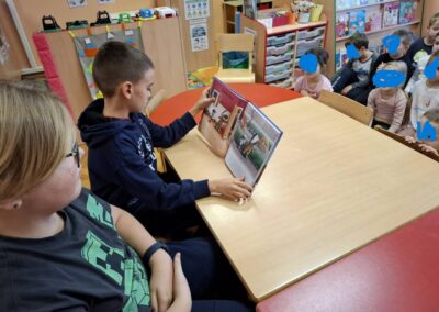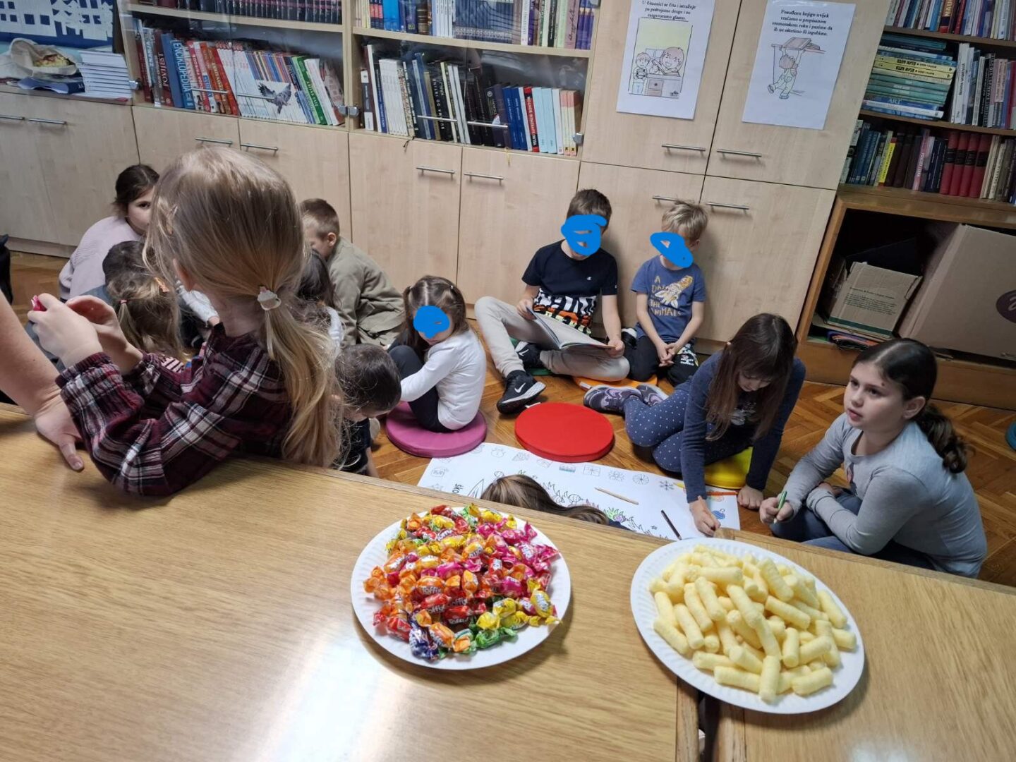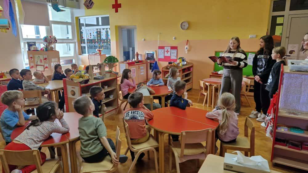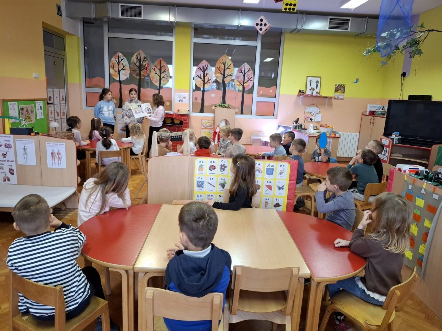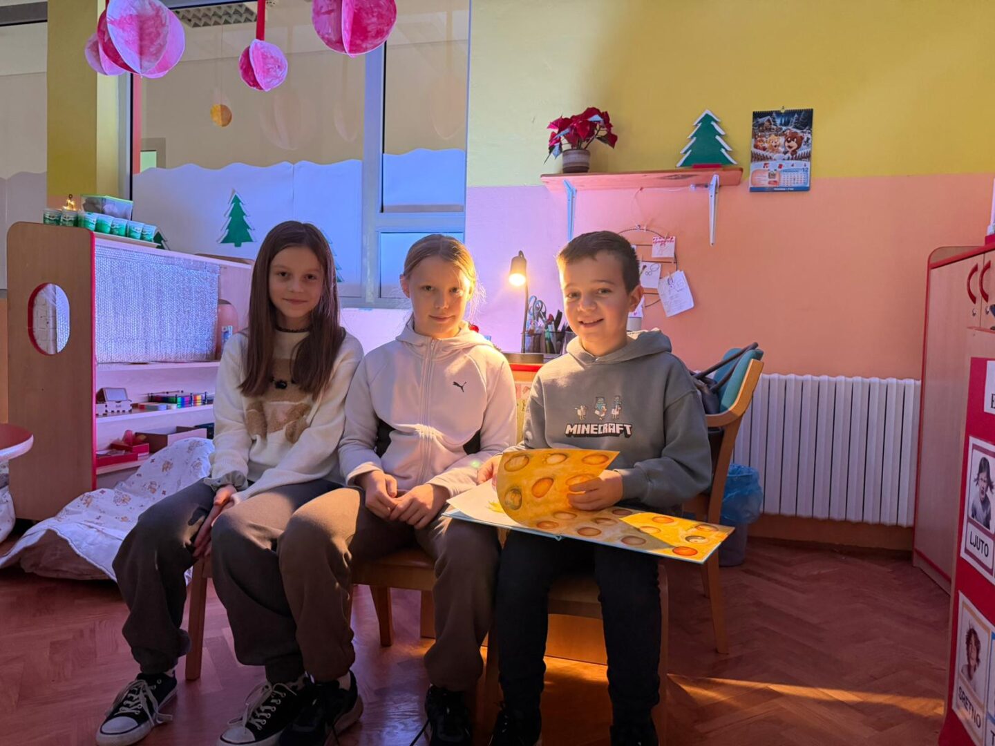 U suradnji s Dječjim vrtićem Slunj od listopada do prosinca ove godine provodili smo književni projekt „Veliki čitaju malima“. Projekt je započeo 27. listopada 2025. godine na Međunarodni dan školskih knjižnica kada je mješovita vrtićka skupina „Sovice“ posjetila školsku knjižnicu. Malene „Sovice“ su tada poslušale priču „Jesenski Jesenko“ i igrale jezičnu igru Alias. S obzirom na to da smo svjesni koliko je važno poticanje čitanje od najranije dobi, spontano smo se dogovorili nastavak druženja sa „Sovicama“. Dogovorili smo se da će učenici trećih i četvrtih razreda odlaziti u njihovu skupinu i čitati im slikovnice. Ostvarili smo devet čitanja u kojima su sudjelovala 24 učenika. Čitali smo slikovnice: „Imam čudovište ispod kreveta“, „Mrljek i Prljek“, „Ružno pače“, „Moji novi prijatelji“, „Vuk osjeća krivnju“, „Vjeverice svađalice“, „Kako živi Antuntun“, „Božićne snjegopriče“, „Sjeverni jelen i dobrota“. U čitanju su uživali i veliki i mali. Sovice su posjetile i 4. a razred u školi, a predivno druženje zaokružili smo završnim druženjem u knjižnici. U knjižnici su vrtićanci pogledali animirani film „Božićna noć“, a pridružili su im se i svi učenici koji su sudjelovali u projektu. Zajedno su igrali društvene igre, bojali, čitali i uživali. Kako im je bilo pogledajte u galeriji.